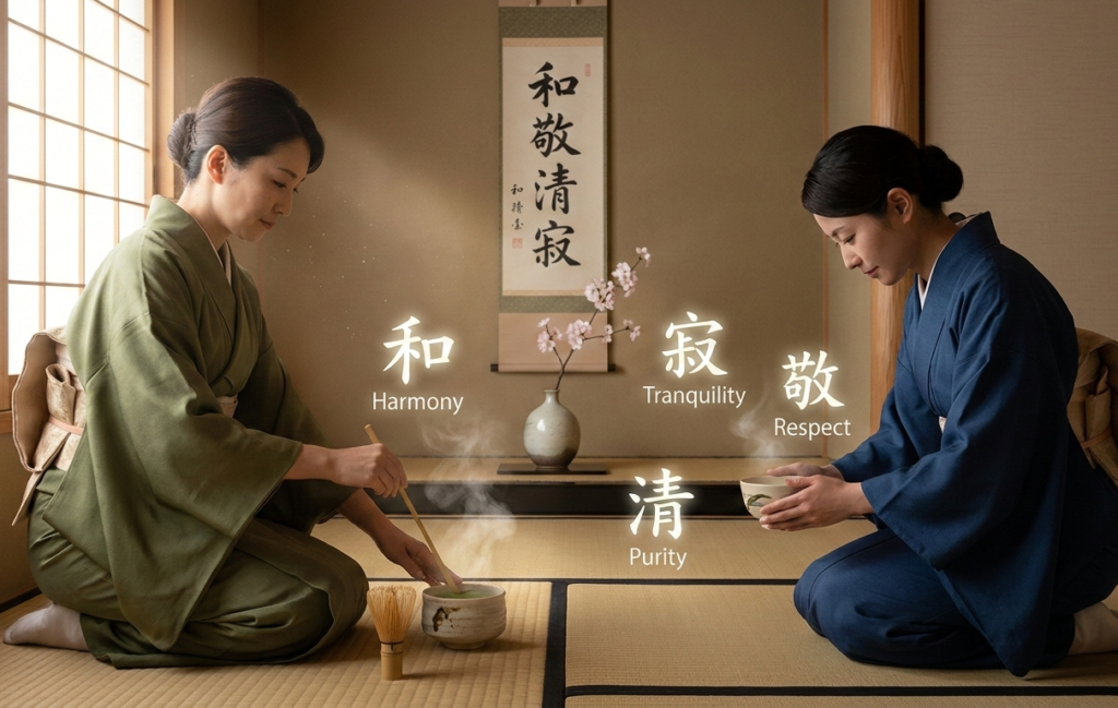Czystość serca: Gdy gospodarz przeciera jedwabną ściereczką (fukusa) pojemnik na herbatę, nie tylko usuwa niewidoczny pył, ale symbolicznie oczyszcza swój umysł z trosk.