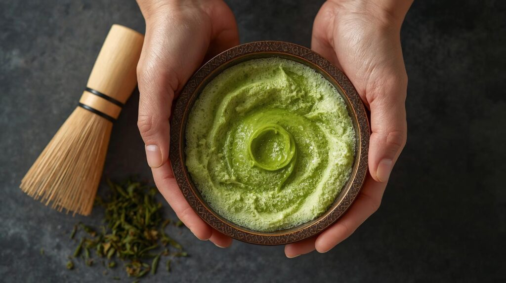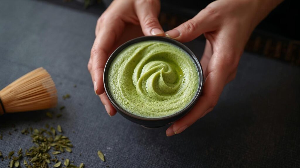 Struktura proszku: Żarna nie tną liści, lecz je „rozcierają”. Dzięki temu cząsteczki Matchy mają postać mikroskopijnych, postrzępionych płatków, co pozwala na stworzenie idealnej, gęstej pianki podczas ubijania bambusową miotełką (chasen).
